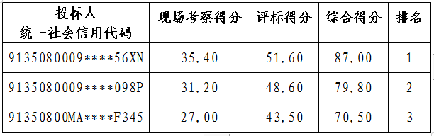现将龙岩投资集团员工食堂2022年承包经营项目邀标综合得分及排名予以公示,公示期间,若有疑议,欢迎以来电、来信、来访的形式及时向龙岩投资集团监察室反映情况。