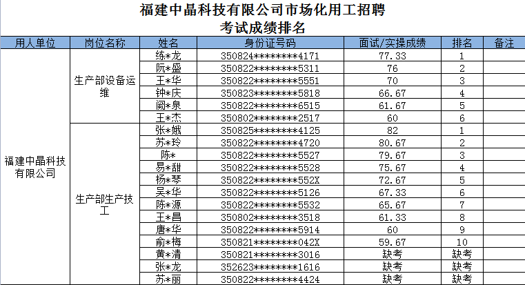 根据2021年11月18日发布的《关于龙岩投资发展集团有限公司公开招聘所属企业工作人员的公告》有关要求,福建中晶科技有限公司生产部设备运维和生产技工2个岗位考试(面试、实操)环节已组织完成。现将考试成绩排名予以公示,公示期为2021年12月20日-12月24日17:30止。