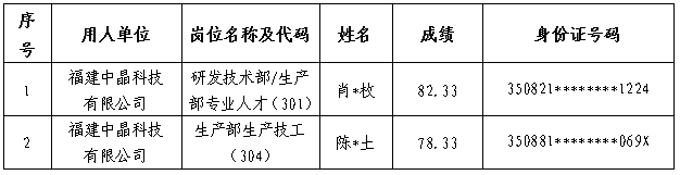 根据2021年11月18日发布的《关于龙岩投资发展集团有限公司公开招聘所属企业工作人员的公告》有关要求,经报名、资格审查、组织面试等程序,确定以下同志为拟聘用人选,现予以公示如下: